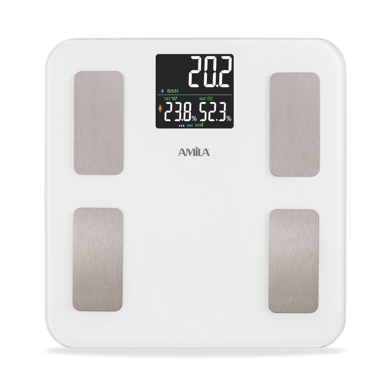 Έξυπνη ζυγαριά AMILA που μετρά ποσοστά λίπους, σωματικής μάζας και συνδέεται με εφαρμογή μέσω κινητο..